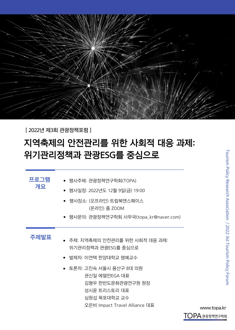 - 주제: 지역축제의 안전관리를 위한 사회적 대응 과제: 위기관리정책과 관광ESG를 중심으로